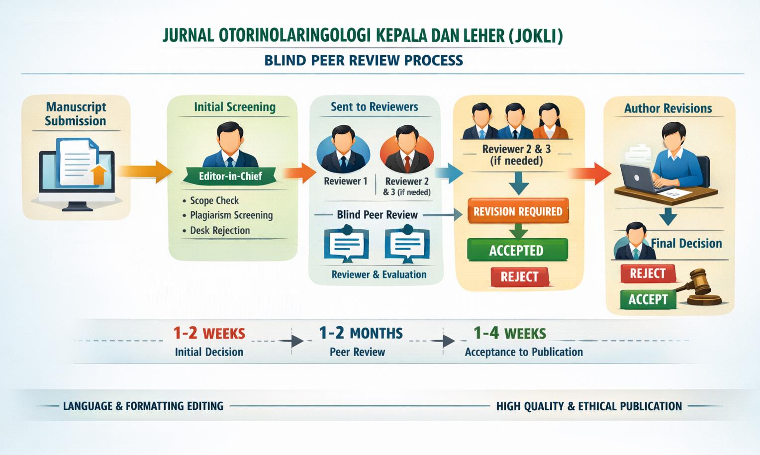 Articles published in Jurnal Otorinolaringologi Kepala dan Leher Indonesia (JOKLI) undergo blind peer review and are managed by the editor through OJS. JOKLI carefully monitors every step of the process, ensuring that all parties involved operate and interact efficiently with the goal of guaranteeing that the published content is of high scientific quality, adheres to ethical research principles, and is released on time.